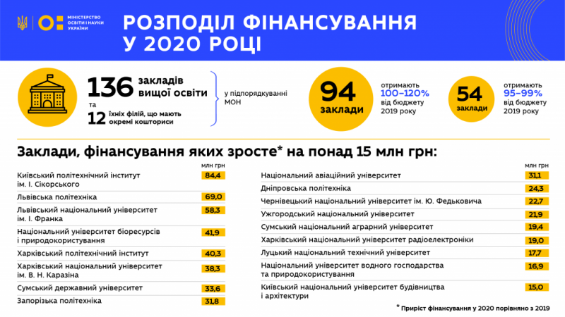 Слід пояснити, що з 2020 року змінено формулу фінансування закладів вищої освіти і тепер університети з кращими результатами діяльності отримують від держави більше грошей. Зокрема, нова формула враховує такі складові як контингент студентів, позиція університету в рейтингах, обсяг коштів на дослідження, міжнародна активність та інтернаціоналізація освіти, масштаб університету. З наступного року також оцінюватиметься і працевлаштування випускників.