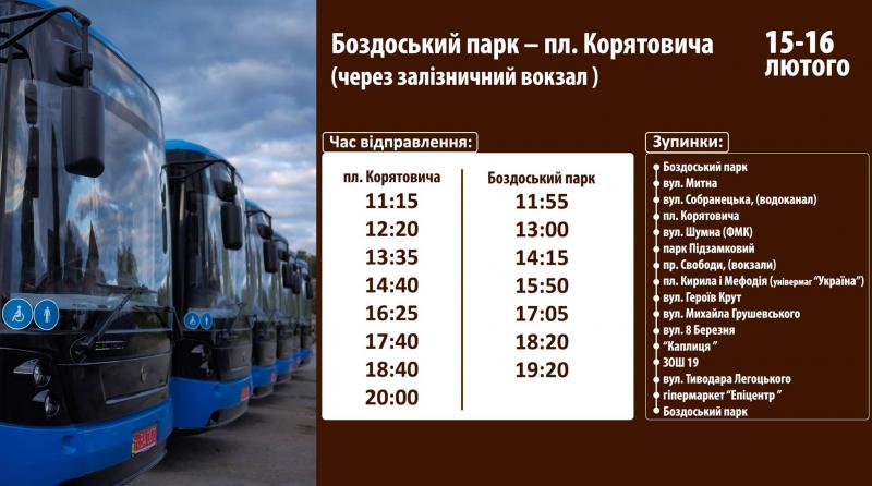 Автобус їздитиме за маршрутом: “Боздоський парк – площа Корятовича (через залізничний вокзал) – Боздоський парк” та робитиме такі зупинки: Боздоський парк, вул. Митна, вул. Собранецька (Волоканал), пл. Корятовича, вул. Шумна (ФМК), парк Підзамковий, пр. Свободи, (вокзали), пл. Кирила і Мефодія (універмаг “Україна”), вул. Героїв Крут, вул. Михайла Грушевського, вул. 8-го Березня, “Каплиця”, ЗОШ 19, вул. Тиводара Легоцького, гіпермаркет “Епіцентр”, Боздоський парк.