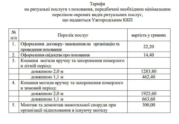В Ужгороді встановлено нові тарифи на ритуальні послуги з поховання