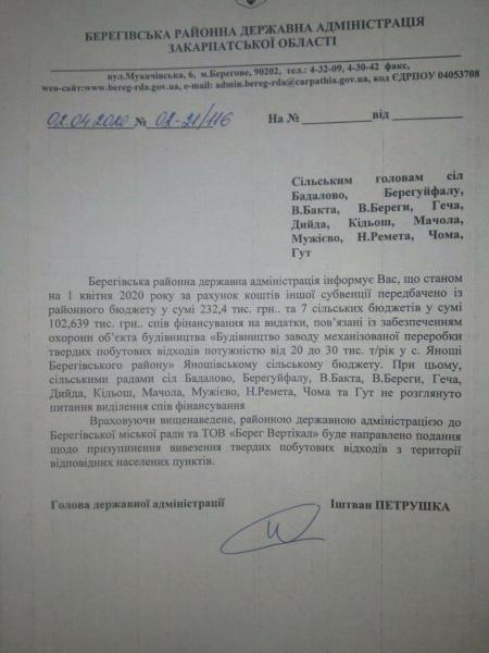 Про призупинення вивозу відходів зазначено в листі Берегівської РДА до голів 12 сіл району.