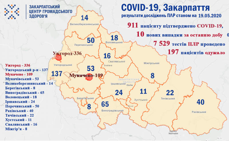 - Загалом по області станом на 19 травня 2020 року 911 хворим встановлено діагноз COVID-19. З них 204 – медичні працівники та 57 - діти. Проведено 7 529 досліджень на полімеразну ланцюгову реакцію.