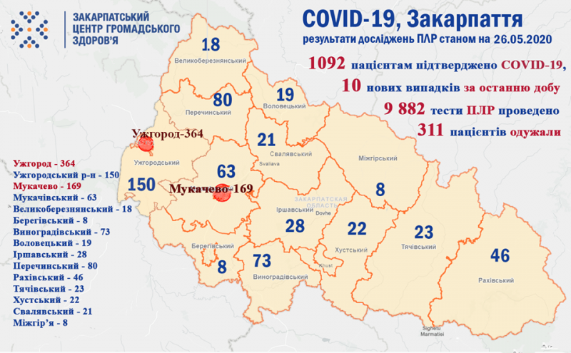 - Загалом по області станом на 26 травня 2020 року 1092 хворим встановлено діагноз COVID-19. З них 247 – медичні працівники та 70 -діти. Проведено 9 882 досліджень на полімеразну ланцюгову реакцію;