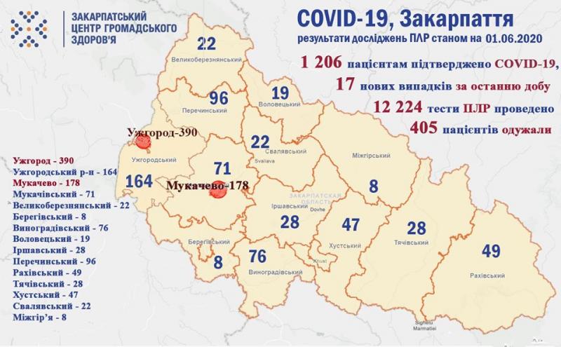 - Загалом по області станом на 1 червня травня 2020 року 1206 хворим встановлено діагноз COVID-19. З них 273 – медичні працівники та 77 –дітей. Проведено 12 224 досліджень на полімеразну ланцюгову реакцію.