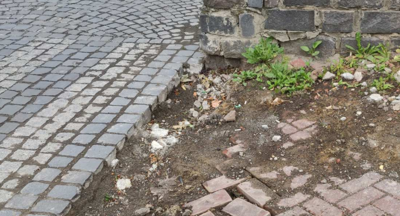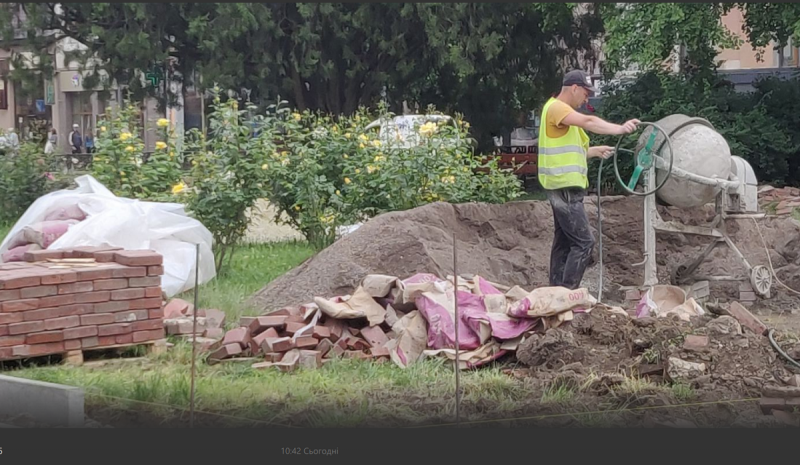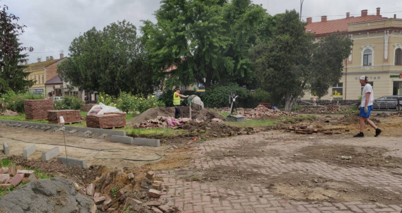 Ремонт зеленої зони площі Петефі в Ужгороді стартував буквально наприкінці травня. Розпочали роботи спочатку в тій частині площі, яка навпроти Ужгородської школи мистецтв. Будівельники вибрали стару плитку, очистили її, склали і, встановивши нові бордюри, знову викладають.
