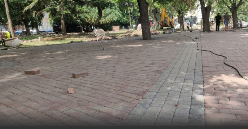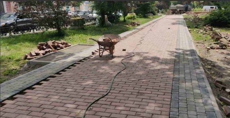Зараз уже виклали доріжки в центральній частині зеленої зони сквера на Петефі.