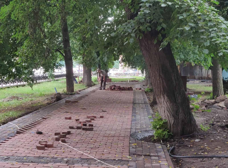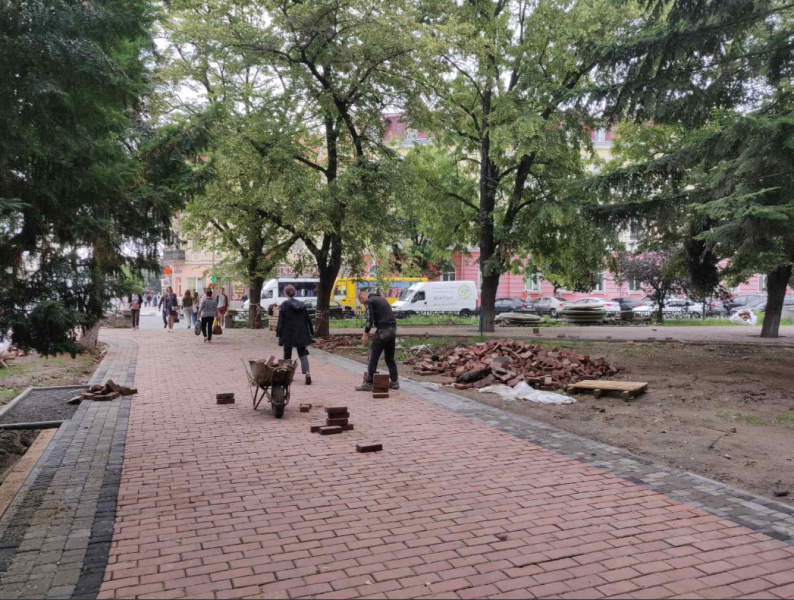 Наразі робітники виконують заміну доріжок у тій частині зеленої зони, яка наближена до Будинку побуту. Тут робіт ще вистачає.