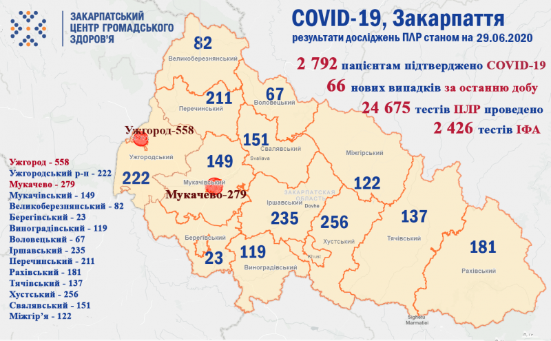 По районах за добу приріст кількості хворих: м. Ужгород (+10), м.Мукачево (+5), Великоберезнянський р-н(+5), Воловецький р-н (+3), Іршавський р-н(+12), Мукачівський (+2), Свалявський р-н (+5), Хустський р-н (+24).