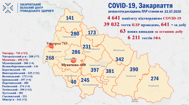 Станом на ранок 23 липня, проведено 39 032 дослідження COVID-19 методом ПЛР та 6 211 тестів ІФА.