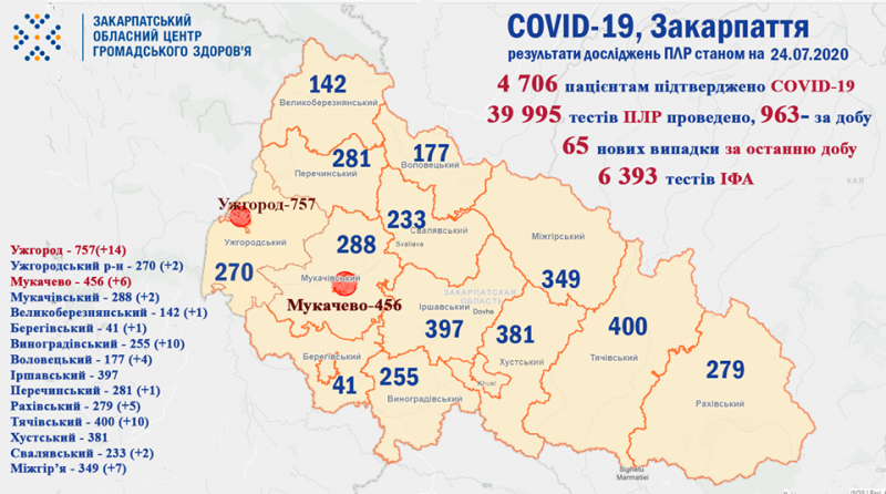 Станом на ранок 24 липня, проведено 39 995 досліджень COVID-19 методом ПЛР та 6 393 тести ІФА.