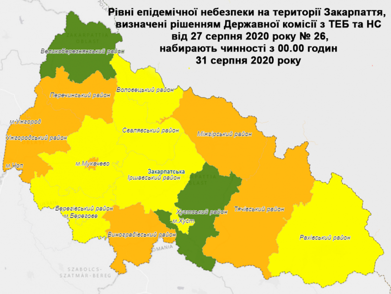 В Закарпатті до помаранчевої зони віднесено: міста Ужгород, Мукачево та Чоп, Виноградівський, Міжгірський, Перечинський, Тячівський та Ужгородський райони.