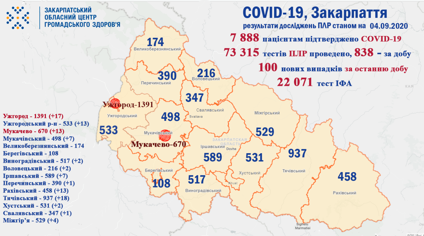 До помаранчевої зони з 7 вересня належать: міста Ужгород, Мукачево та Чоп, Виноградівський, Міжгірський, Мукачівський, Тячівський та Ужгородський райони Закарпатської області.