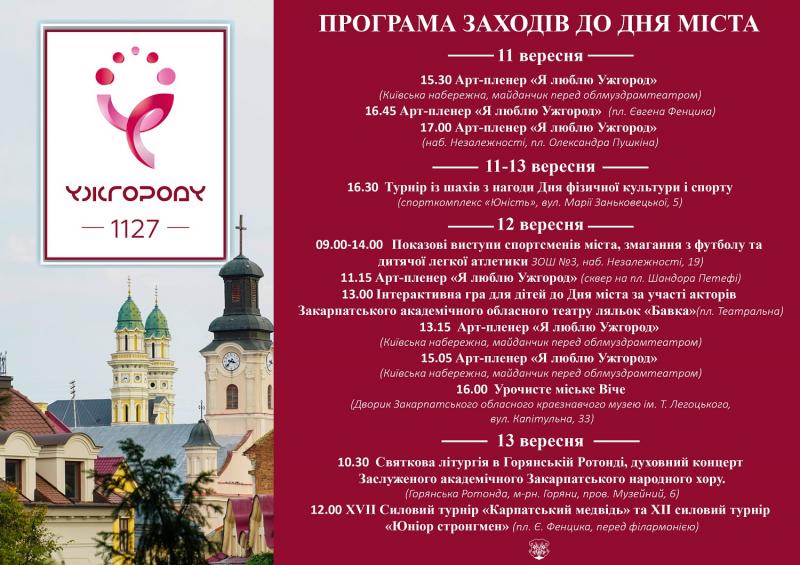 Масштабних святкувань до Дня Ужгорода цьогоріч не буде через карантинні заходи. Заплановано лише традиційне міське Віче, арт-пленери, спортивні активності, святкова Літургія у Горянській ротонді. Програма святкування - на фото: