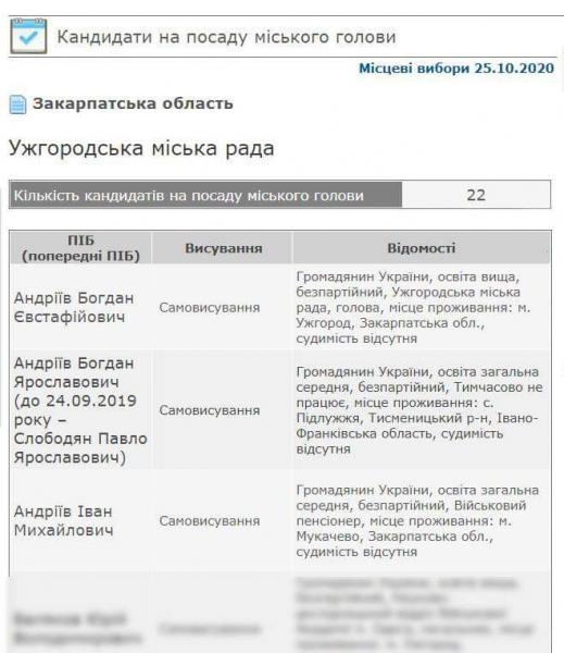 "Учасники прямого ефіру зазначали, що, на жаль, і на цих виборах політичні опоненти користуються такими брудними технологіями. Підкреслювали, що такі речі застосовують не вперше, йшлося і про недосконале законодавство та необхідність його змінити. На жаль, до місцевих виборах 2020 року зміни до виборчого законодавства вже не можна внести. На виборах міського голови Ужгорода зареєстрували двох моїх «двійників». Обидва – не ужгородці, один взагалі став Богданом Андріївим у вересні минулого року, до того був Павлом Слободяном.