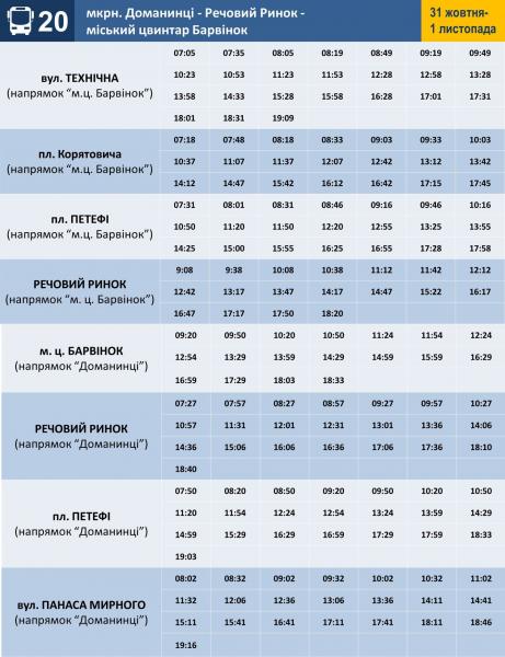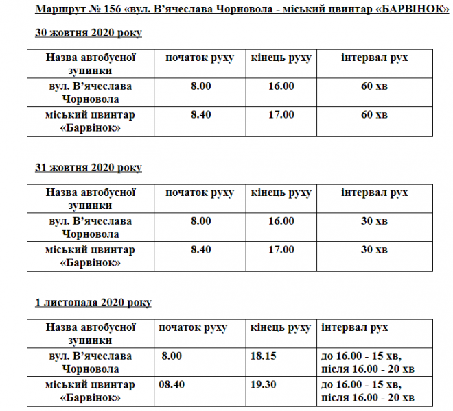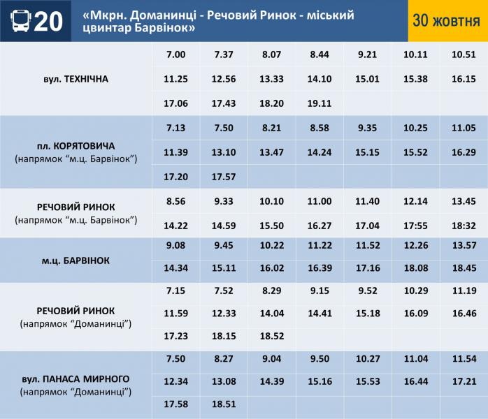 30, 31 жовтня та 1 листопада 2020 року кількість автобусів, які курсують до міського цвинтаря „Барвінок”, буде збільшено