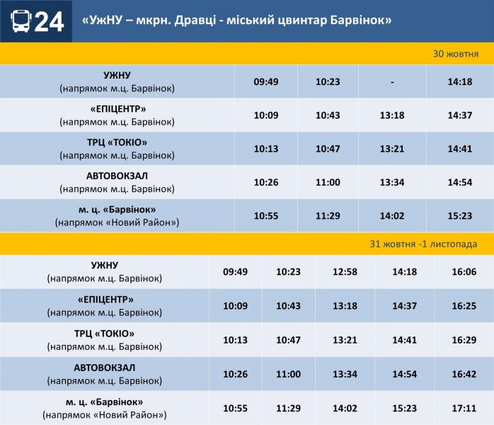 До перевезення пасажирів залучено комунальне підприємство «Ужгородський муніципальний транспорт», яке використовує автобуси «ЕЛЕКТРОН». Для цього маршрут №20 мкрн. «Доманинці» – Речовий ринок (через пл. Корятовича)» та частину автобусів маршруту №24 «УжНУ – мкрн. «Дравці» (через вокзали, «Новий район») продовжено до міського цвинтаря «Барвінок». Це дасть змогу додатково, крім забезпечення перевезення пасажирів на маршрутах №№ 158 та 156, доїхати у ці дні і жителям інших мікрорайонів без пересадок (вул. Загорська, вул. Миколи Бобяка, вул. Собранецька, мкрн. Доманинці тощо) до міського цвинтаря «Барвінок», а також до цвинтаря у мікрорайоні Доманинці.