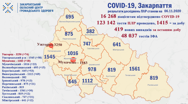 Стрибок заражень COVID-19 на Закарпатті: за добу 419 випадків та 12 пацієнтів померло
