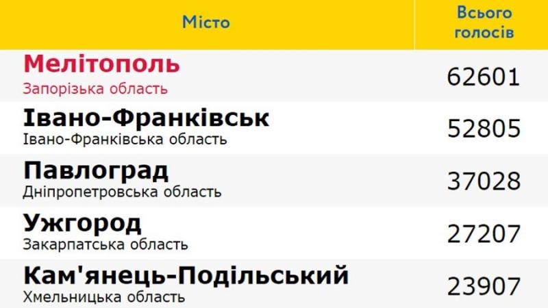Ужгород опинився у рейтингу на 4-му місці. За нього проголосували 27 тисяч 207 людей. На першій сходинці опинився Мелітополь Запорізької області (62 тис. 601).