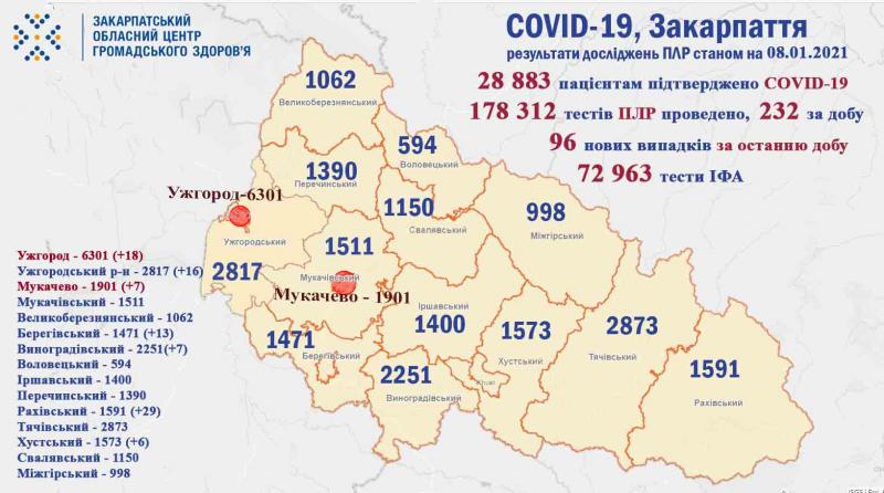 - від початку пандемії 28 883 закарпатцям встановлено діагноз COVID-19, із яких 2 232 – медики та 1489 – діти ;