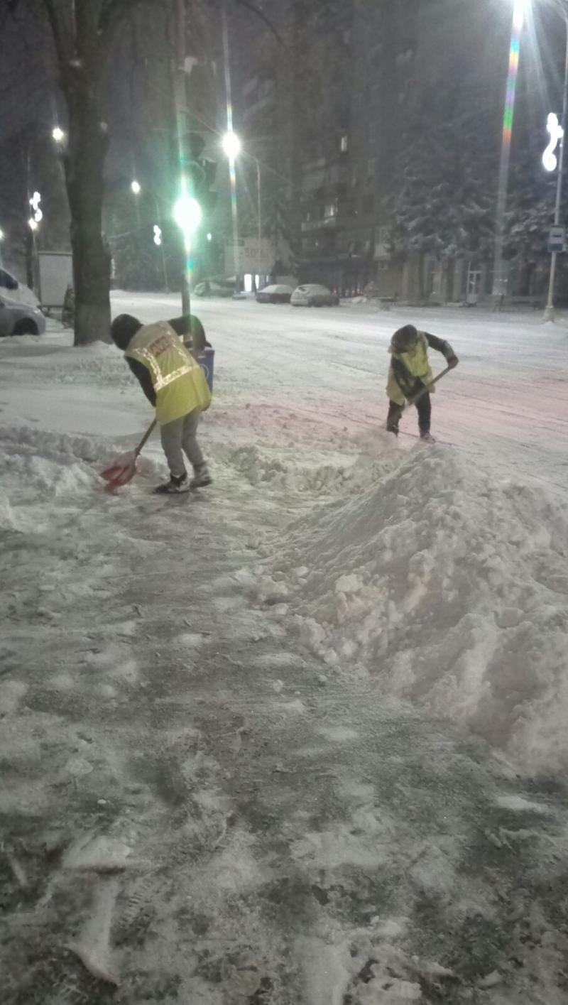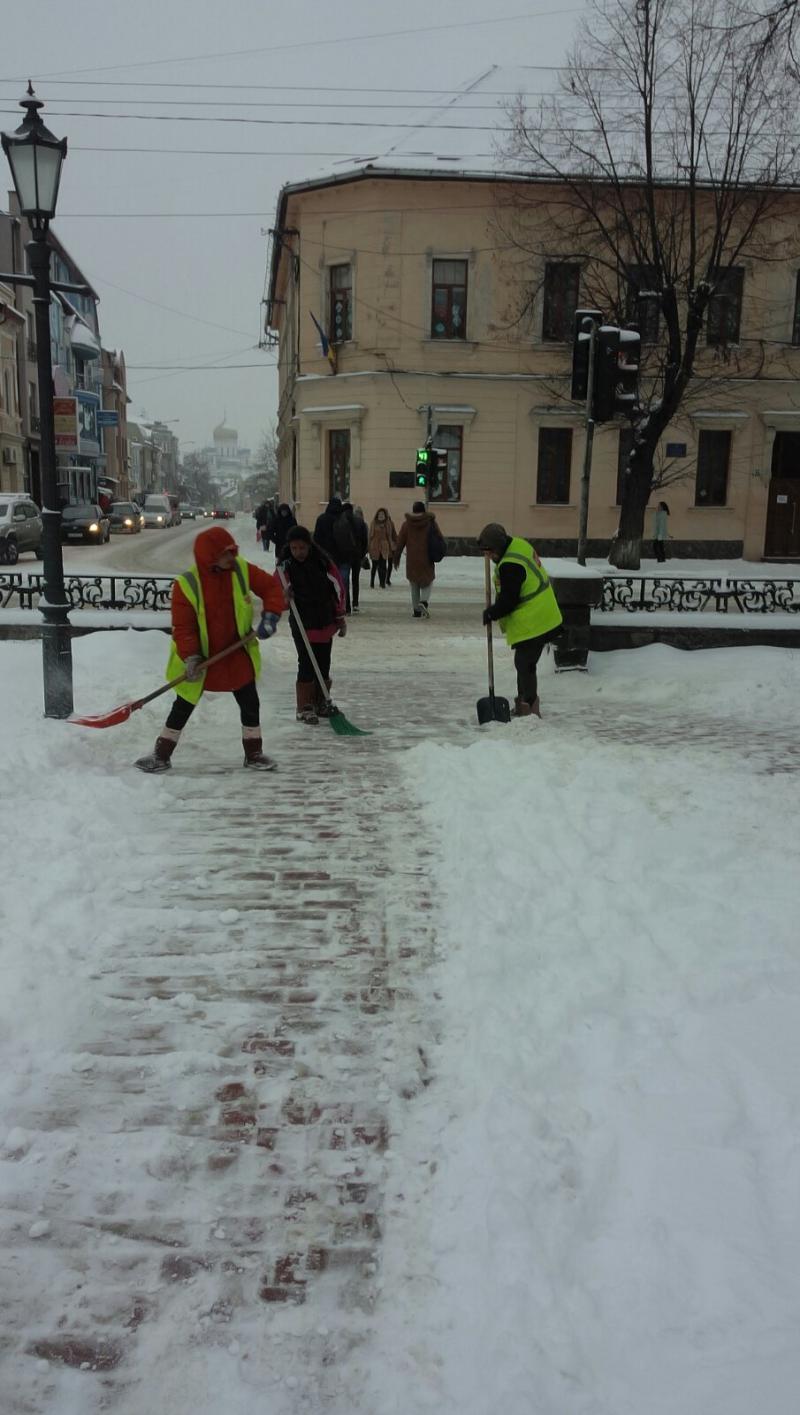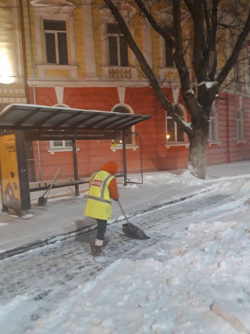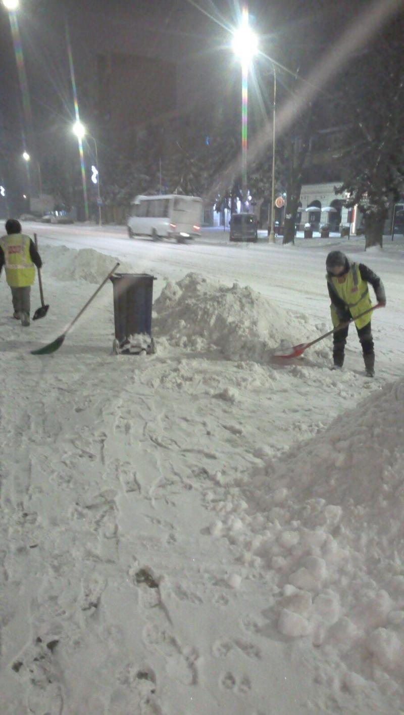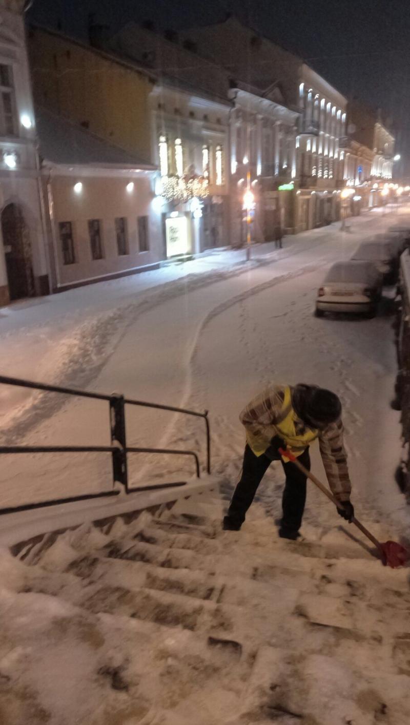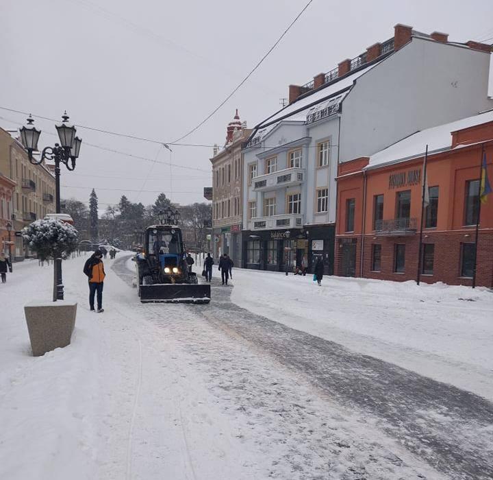 Працівники комунальних служб в Ужгороді розчищають сніг: уночі вулиці обробили протиожеледною сумішшю, потім розпочали прибирання центральних магістралей, підйомів, транспортних кругів за допомогою спецтехніки. Двірники розчищають автобусні зупинки, пішохідні переходи, тротуари.