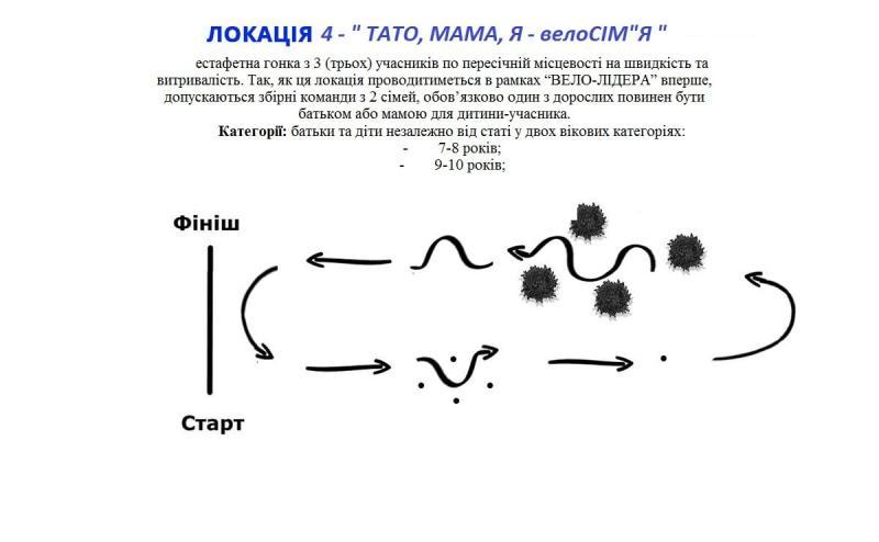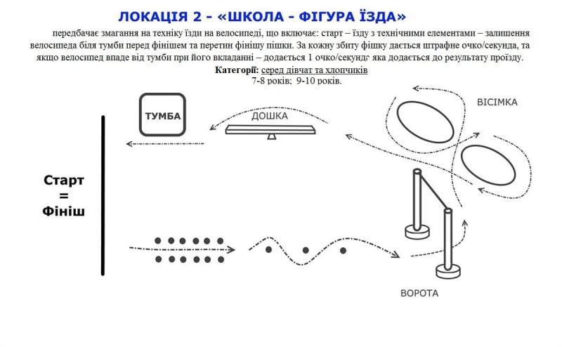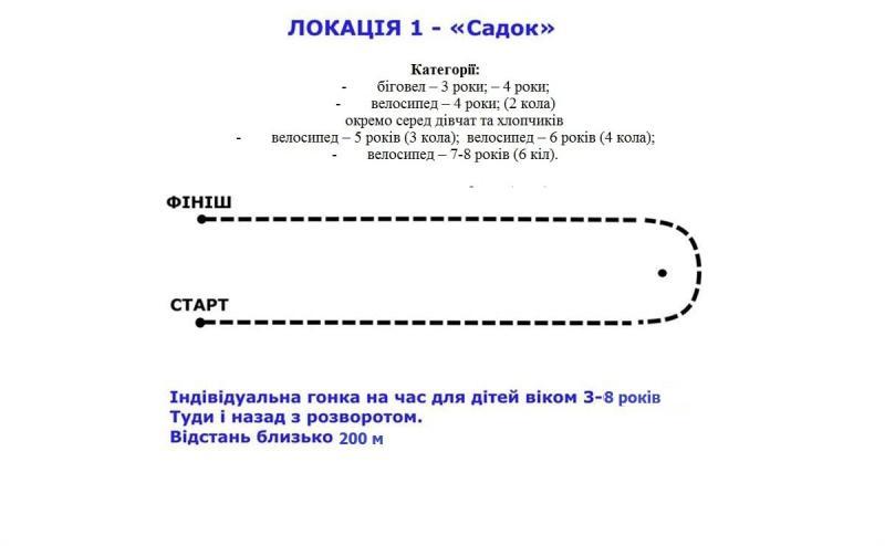 Змагання проводитимуть окремо серед дівчат та хлопців за віковими категоріями на чотирьох локаціях: „Садок” (3-8 років); „Школа їзди” (7-10 років), „Крос-кантрі” (9-14 років) та сімейна естафета „Тато, мама, я – вело-СІМ’Я”.