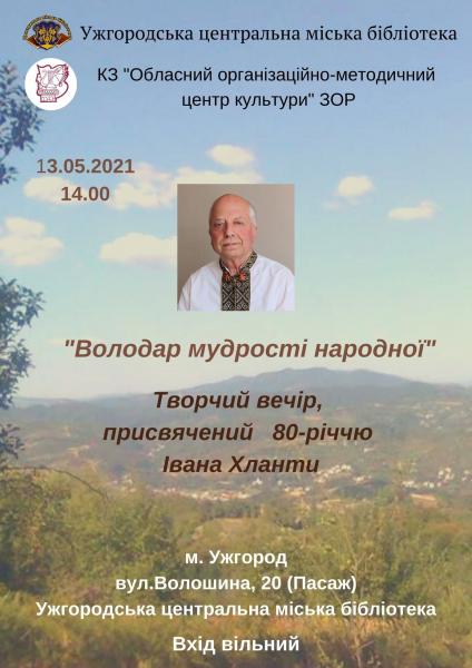 13 травня в Ужгородській центральній міській бібліотеці відбудеться ювілейний творчий вечір з нагоди 80-річчя Івана Хланти – заслуженого діяча мистецтва України, фольклориста, кандидата філологічний наук, провідного методиста комунального закладу «Обласний організаційно-методичний центр культури» Закарпатської обласної ради.
