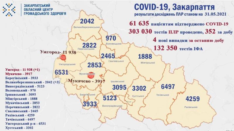 Станом на ранок 31 травня на Закарпатті зареєстрували 4 нові випадки COVID-19, що на 16 менше, ніж за минулу добу. Такі дані повідомляє Закарпатський обласний центр громадського здоров’я. За добу одужали 25 людей, один пацієнт помер.
