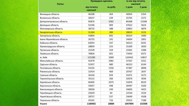 За добу на Закарпатті вакцинували від COVID-19 майже 400 людей