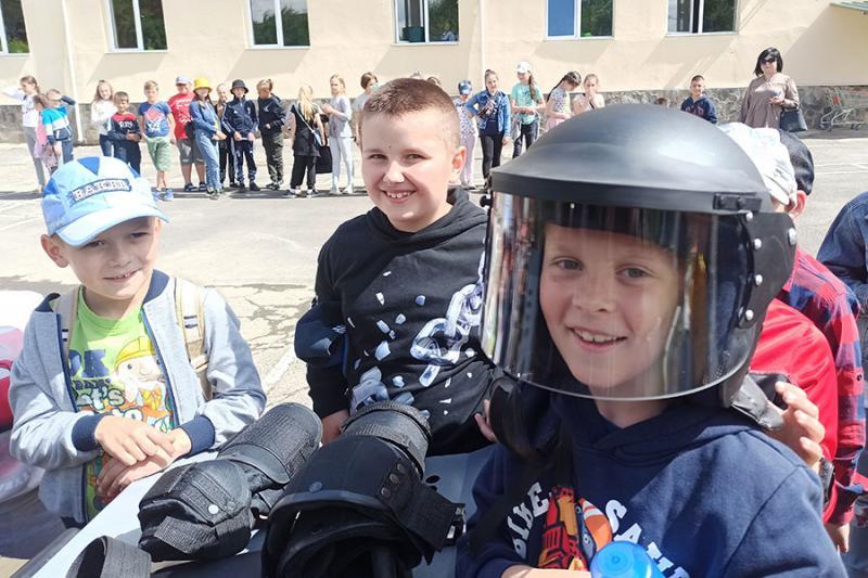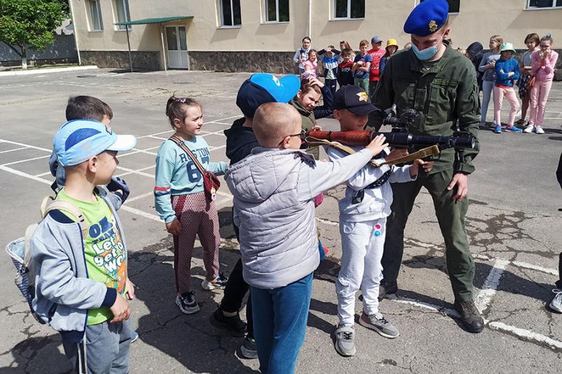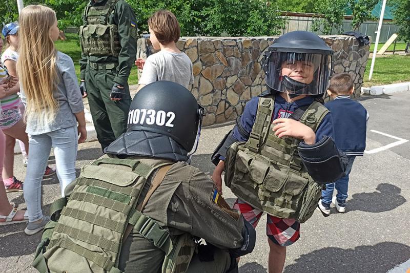 На території батальйону національні гвардійці продемонстрували дітворіозброєння, спеціальні засоби та техніку, якими користуються у повсякденній діяльності. Малеча із захопленням оглядала зброю, приміряла шоломи, протигази та інше спорядження.