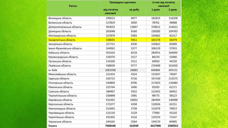 Майже 6 тисяч закарпатців отримали щеплення від COVID-19 упродовж доби