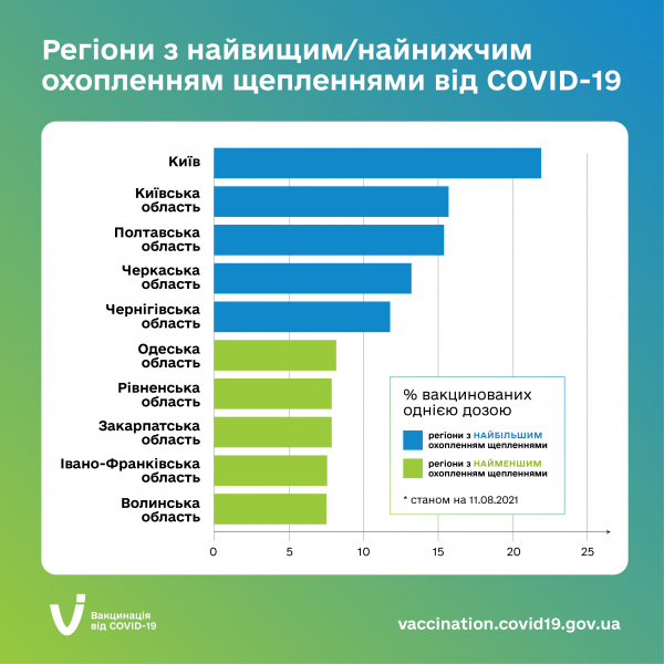 Абсолютним лідером за охопленням щепленнями від COVID-19 дорослого населення є місто Київ, де провакциновано принаймні однією дозою майже 667 тис. жителів, двома дозами – 395 тис. В першій п’ятірці також Київська, Полтавська, Черкаська та Чернігівська області.