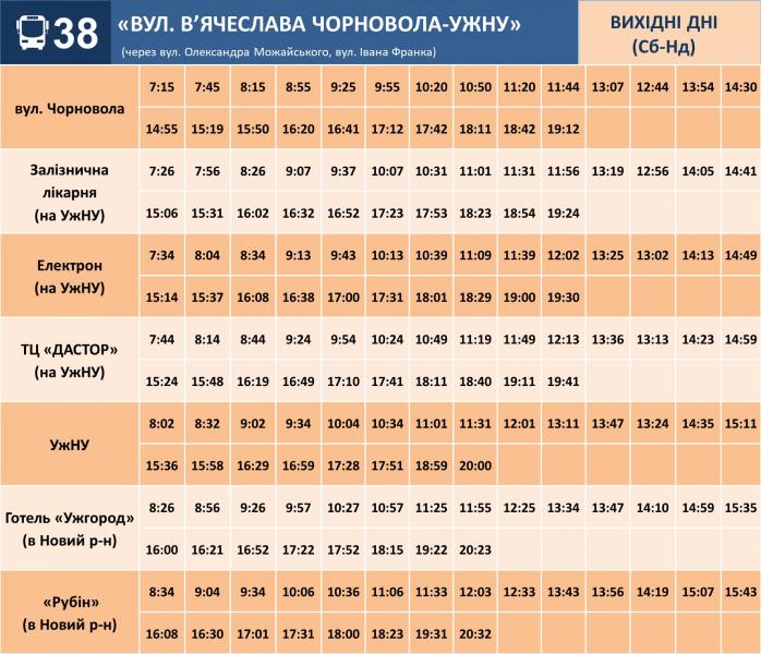 Графік руху автобусів на міському маршруті №38 в Ужгороді у вихідні та святкові дні