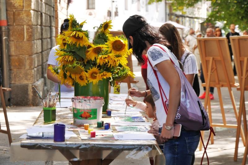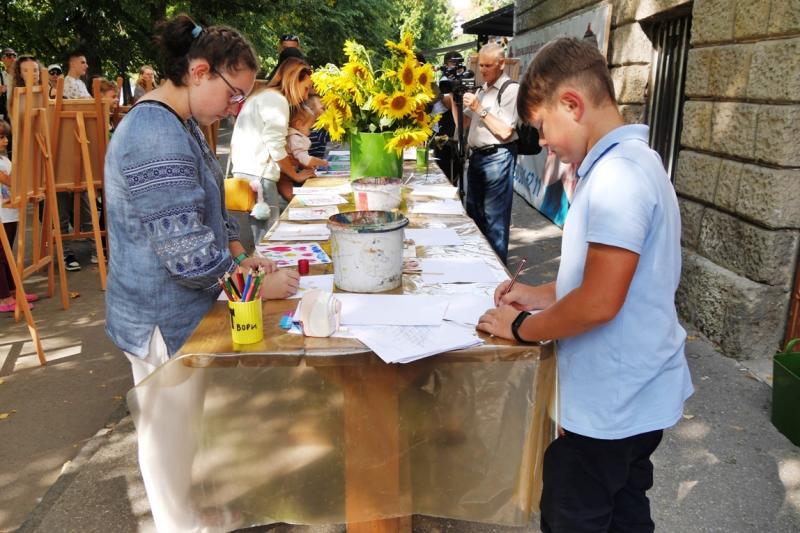 Митець одразу на набережній творить натюрморт із соняшниками, допомагає діткам порадами, підтримує похвалою. Запланована також спільна робота над одним живописним полотном.