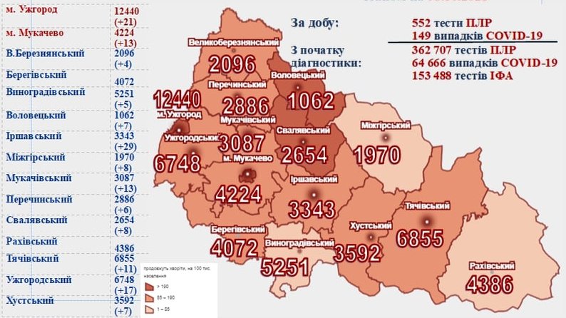 За даними закарпатського обласного центру громадського здоров’я, загалом в області з початку пандемії діагноз COVID-19 встановили у 64 666 людей. 61 167 пацієнтів подолали хворобу, 1 651 — помер.