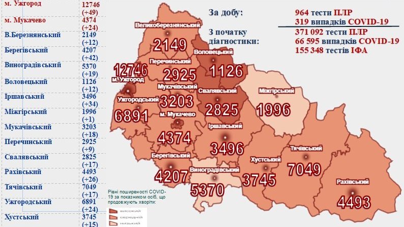 За даними закарпатського обласного центру громадського здоров’я, загалом в області з початку пандемії діагноз COVID-19 встановили у 66 595 людей. 61 738 пацієнтів подолали хворобу, 1 701 — помер.