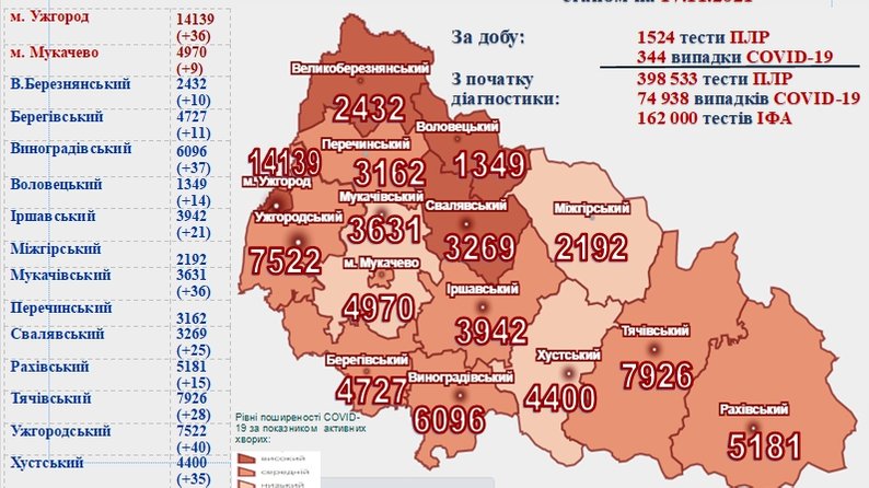 344 нові випадки захворювання на коронавірус підтвердили на Закарпатті впродовж доби 16 листопада. Про це повідомили на сторінці Закарпатського обласного центру громадського здоров'я у Facebook.