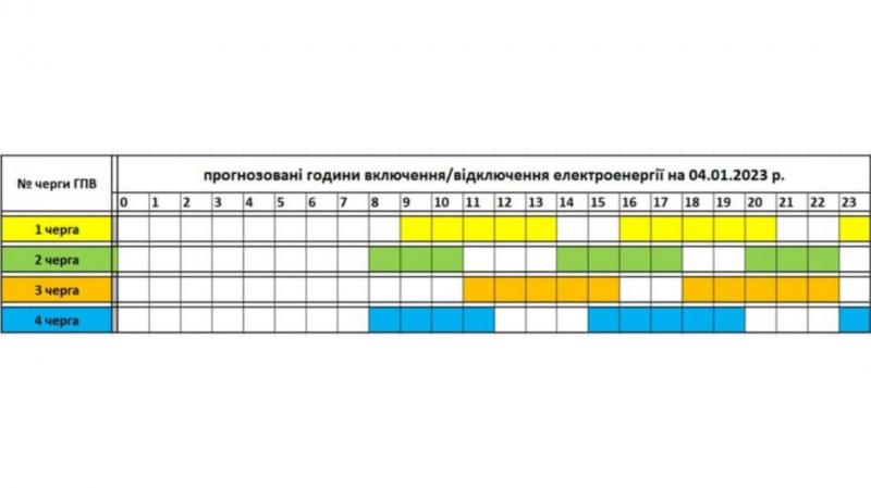 Прогнозований графік відключень електроенергії на Закарпатті на 4 січня опублікували на Facebook-сторінці "Закарпаттяобленерго". Наразі в регіоні діють чотири черги погодинних відключень.
