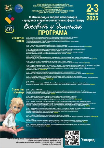 Закарпатський академічний обласний театр ляльок анонсує проведення в Ужгороді ІІ Міжнародної творчої лабораторії-артдіалогу візуально-пластичних форм театру «Всесвіт у долонях» – 2-3 жовтня.