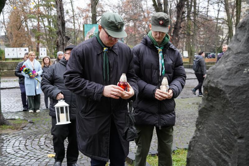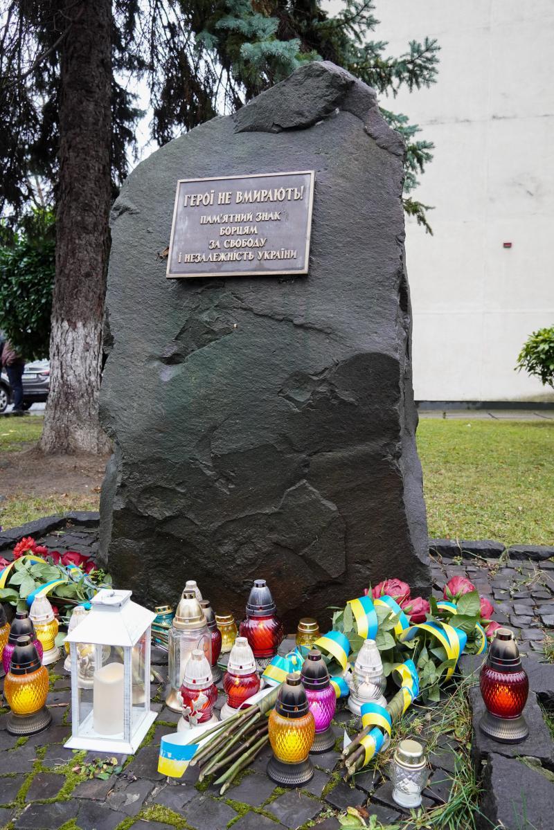 В Ужгороді на площі Народній керівництво області та міста, пластуни, військові, представники громадськості запалили лампадки та поклали квіти до пам’ятного знаку борцям за свободу й незалежність.