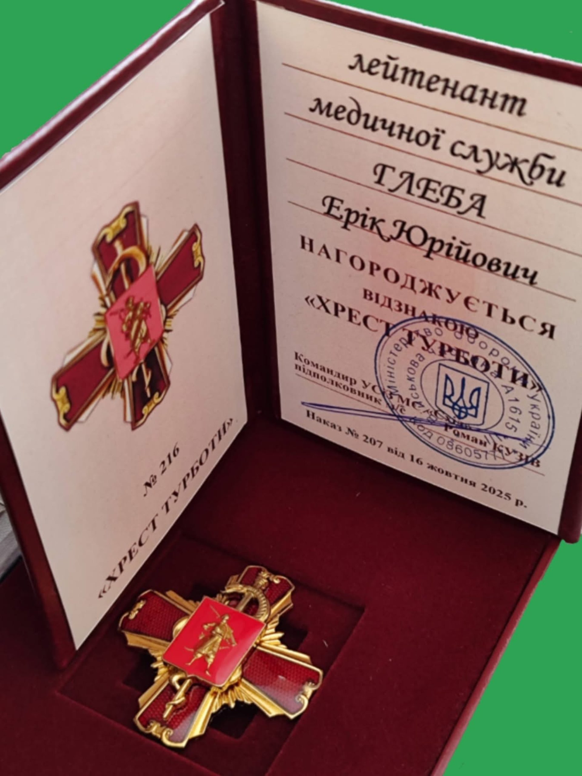 «Сьогодні маю за честь отримати відзнаку «Хрест Турботи». Ця нагорода для мене — не просто метал, а символ нашої спільної щоденної боротьби за життя тих, хто стоїть на захисті України», — написав Ерік Глеба на своїй фейсбук-сторінці.