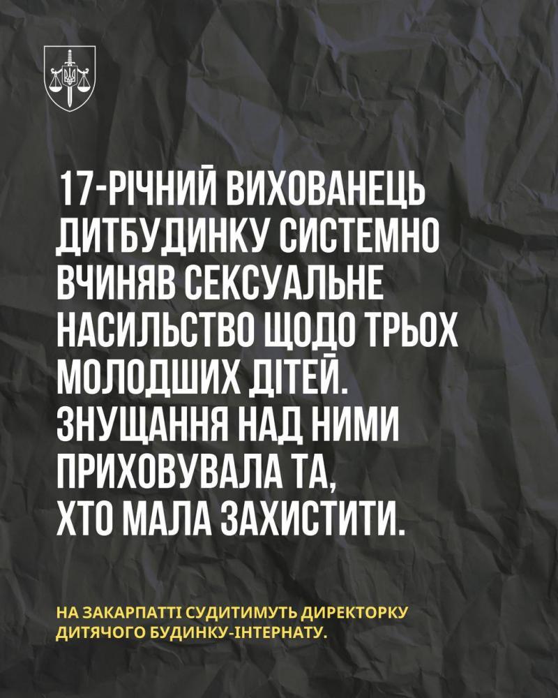 У межах загальнодержавної роботи на Закарпатті судитимуть колишню директорку дитячого будинку-інтернату, яка, за даними слідства, приховувала факти сексуального насильства щодо вихованців закладу.