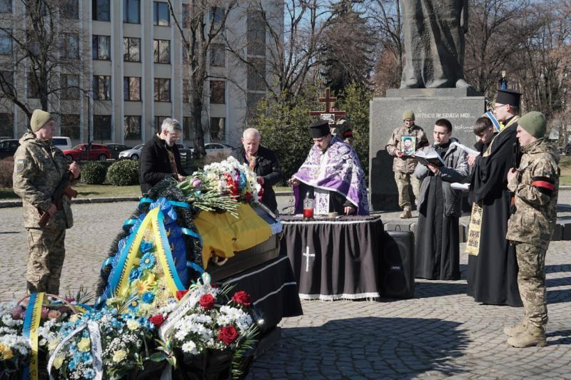 Чин похорону відбувся на площі Народній. Провести воїна в останню путь прийшли міський голова Богдан Андріїв, військові, містяни.