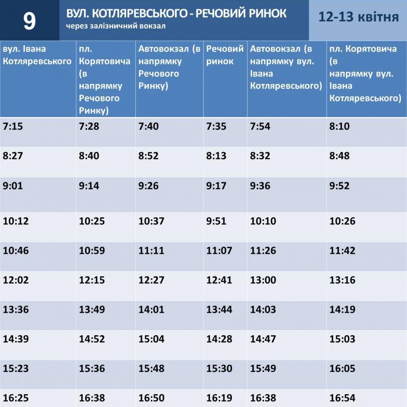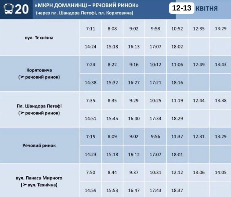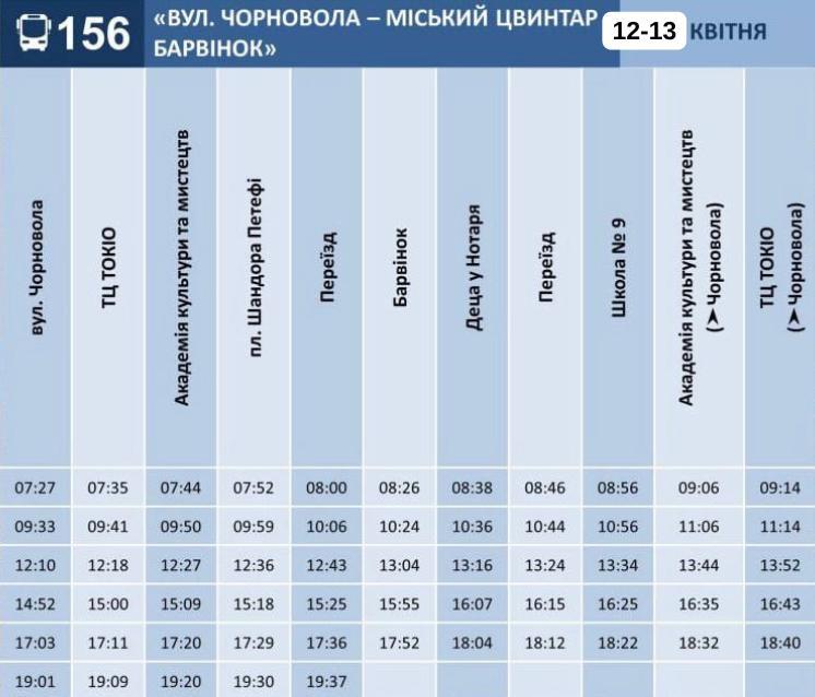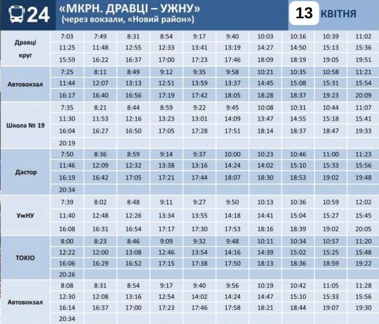 Комунальне підприємство "Ужгородський муніципальний транспорт" надає графіки руху автобусів №№9, 18, 20, 22, 24 та 156 на Великодні свята 12-13 квітня 2026 року.