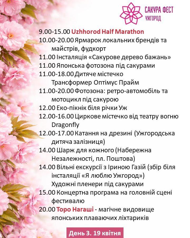 Понад 30 атракцій – від вогняного шоу до масштабних інсталяцій, від караоке до насиченої концертної програми, від фотозон до екскурсій, виставок і дитячого містечка – чекають на глядачів, учасників і відвідувачів! Хтось вперше побачить квіт сакури, а хтось зробить чергове фото на пам’ять про рожевий сезон, але кожен і кожна зможе стати частиною великої мети – зібрати 1000000 гривень на підтримку Збройних Сил України!