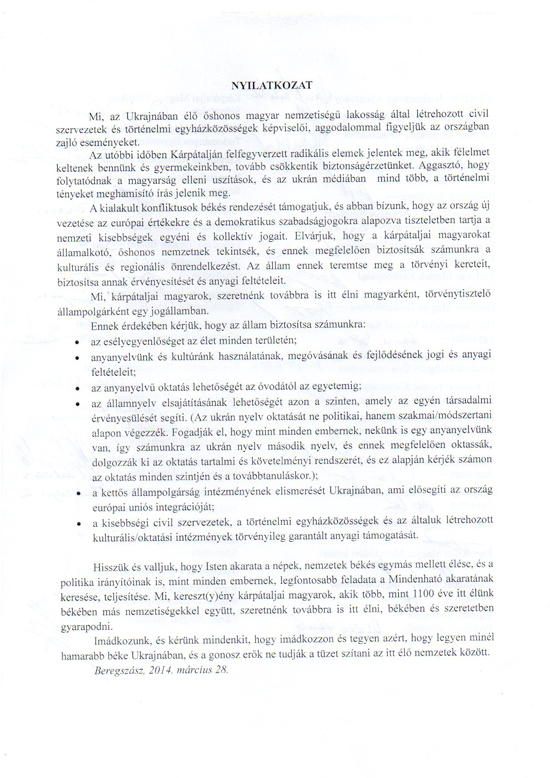 Віримо й стверджуємо, що мирне проживання один біля одного народів та національностей є Божою волею, і для політичних керівників, як для кожної людини, найважливішим завданням є пошук виконання цієї Божої волі. Ми, угорці-християни, є корінним населенням Закарпаття, проживаємо тут вже понад 1100 років в мирі разом з іншими національностями, і хочемо й надалі тут проживати в мирі та злагоді.