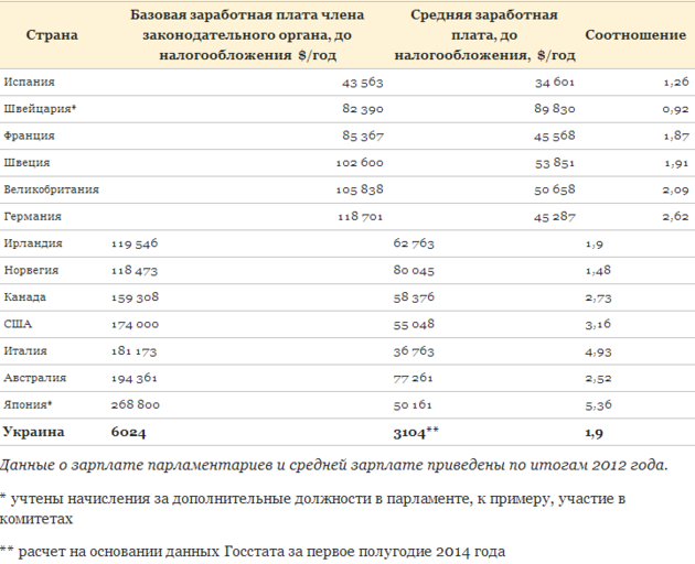 Абсолютні цифри заробітку членів законодавчих органів в розвинених країнах світу багаторазово перевищують дохід засідателів Верховної Ради. Однак якщо порівняти їх із середньою зарплатою у відповідній країні, то можна констатувати цікаву закономірність: різниця небагато чим відрізняється від українського співвідношення.