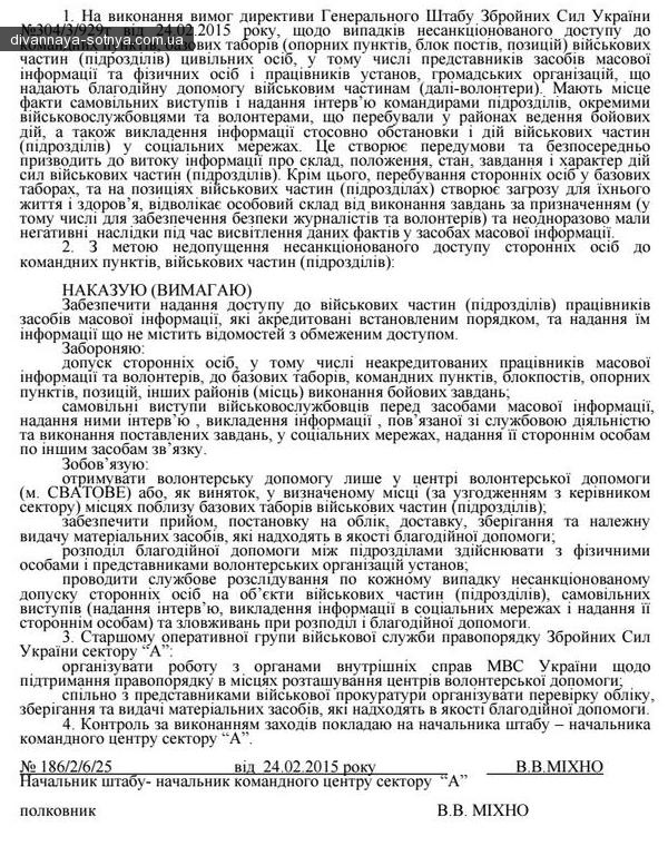Документи такого характеру відправляються офіцерам різних бригад на передову, зокрема такий наказ отриманий силовиками, блокпост яких розміщується на найбільш небезпечному напрямку в Луганській області — селі Кримське. Згідно наказу, волонтерам та неакредитованим журналістам не тільки забороняється з'являтися в базових таборах, командних пунктах і на блокпостах ВСУ. Тепер волонтери повинні всю привезену допомогу залишати на загальному волонтерському пункті в місті Сватове. У разі виявлення фактів порушення даного наказу такі випадки будуть розслідуватися і порушники будуть притягуватися до відповідальності.