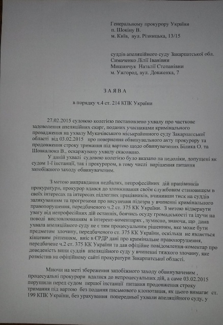Як інформують судді, прокурор Закарпаття В.Янко вніс до ЄРДР дані про кримінальне порушення, "боячись осуду громадськості" та "зумисно, знаючи, що дана ухвала апеляційного суду не є тим процесуальним рішенням, яке може бути предметом злочину..., та дав офіційне повідомлення-коментар про доведеність вини суддів... у вчиненні тяжкого злочину, яке розмістив на офіційному сайті прокуратури Закарпатської області".