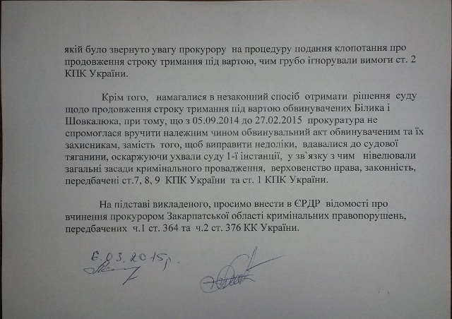 У цьому контексті Лілія Симаченко та Наталія Мишинчук просять Генерального прокурора України внести до Єдиного реєстру досудових розслідувань "відомості про вчинення прокурором Закарпатської області кримінальних правопрушень, передбачених ч.1 ст. 364 та ч.2 ст. 376 КК України".