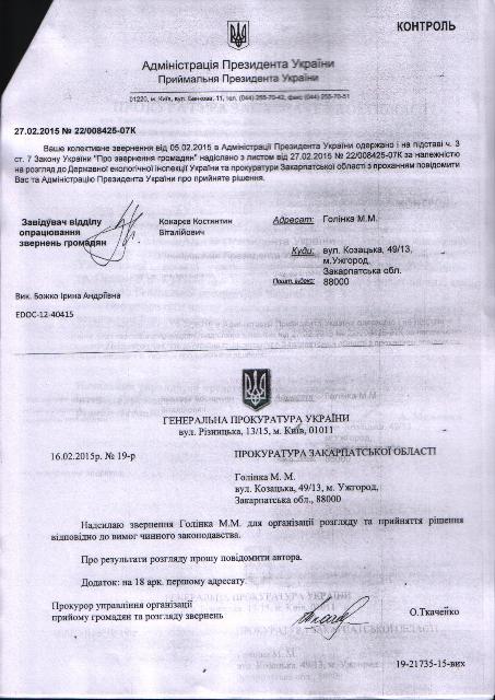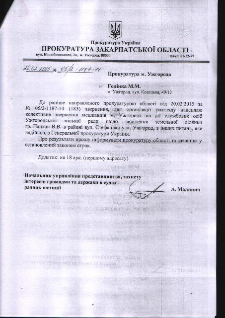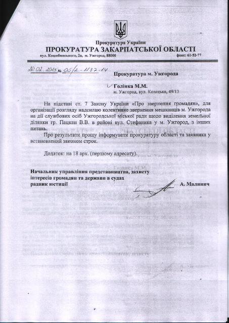 За словами Надії Попадюк, відповідно до чинного закону «Про статус народного депутата України» неприпустимим є використання мандату нардепа в особистих корисливих цілях. «Порушуючи дві норми закону, на той момент В.Пацкан, будучи власником земельної ділянки площею 0,8061 га, тобто будучи зацікавленою особою, використовує депутатський мандат та звертається до прокурора Закарпатської області про скасування у судовому порядку рішення Ужгородської міськради №1582 від 17.09.2010 (п.6.8) «Про регулювання земельних відносин», згідно з яким було затверджено містобудівну документацію на весь район вул..Стефаника в Ужгороді та державних актів про право власності на землю, виданих на підставі цього рішення (тобто скасування конституційного права власності на землю 500 ужгородських сімей), - каже жінка. - Враховуючи той факт, що в Україні не відбулася судова реформа, судді не потрапили під дію люстраційного законодавства, ми звернулися до Президента, Генпрокурора та інших високопосадовців з проханням перевірити факт отримання земельної ділянки В.Пацканом та захистит наше гарантоване Конституцією право на землю. Однак у відповідь отримали лише відписки про перенаправлення справи на місцевий рівень, де вирішення питання на користь громадян, враховуючи зв’язки В.Пацкана здається неможливим»..jpg)