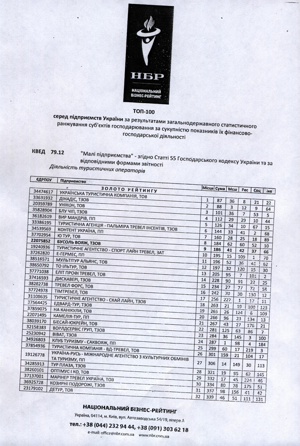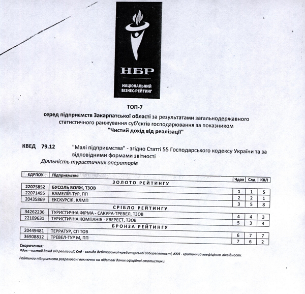 Саме таке сповіщення отримала днями закарпатська туристична фірма “Бусоль-вояж”. Серед підприємств України за результатами загальнодержавного статистичного ранжування суб’єктів господарювання за сукупністю показників їх фінансово-господарської діяльності “Бусоль –вояж” посів дев’яте місце. У аналогічній таблиці конкретно Закарпатської області фірма займає почесне перше місце і очолює трійку “золота” рейтингу.